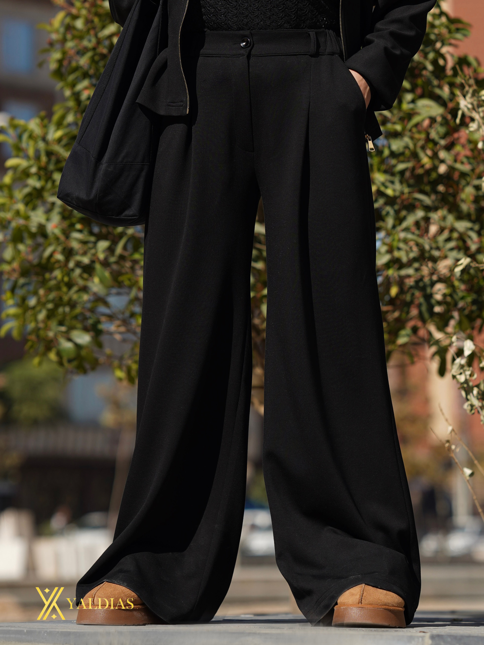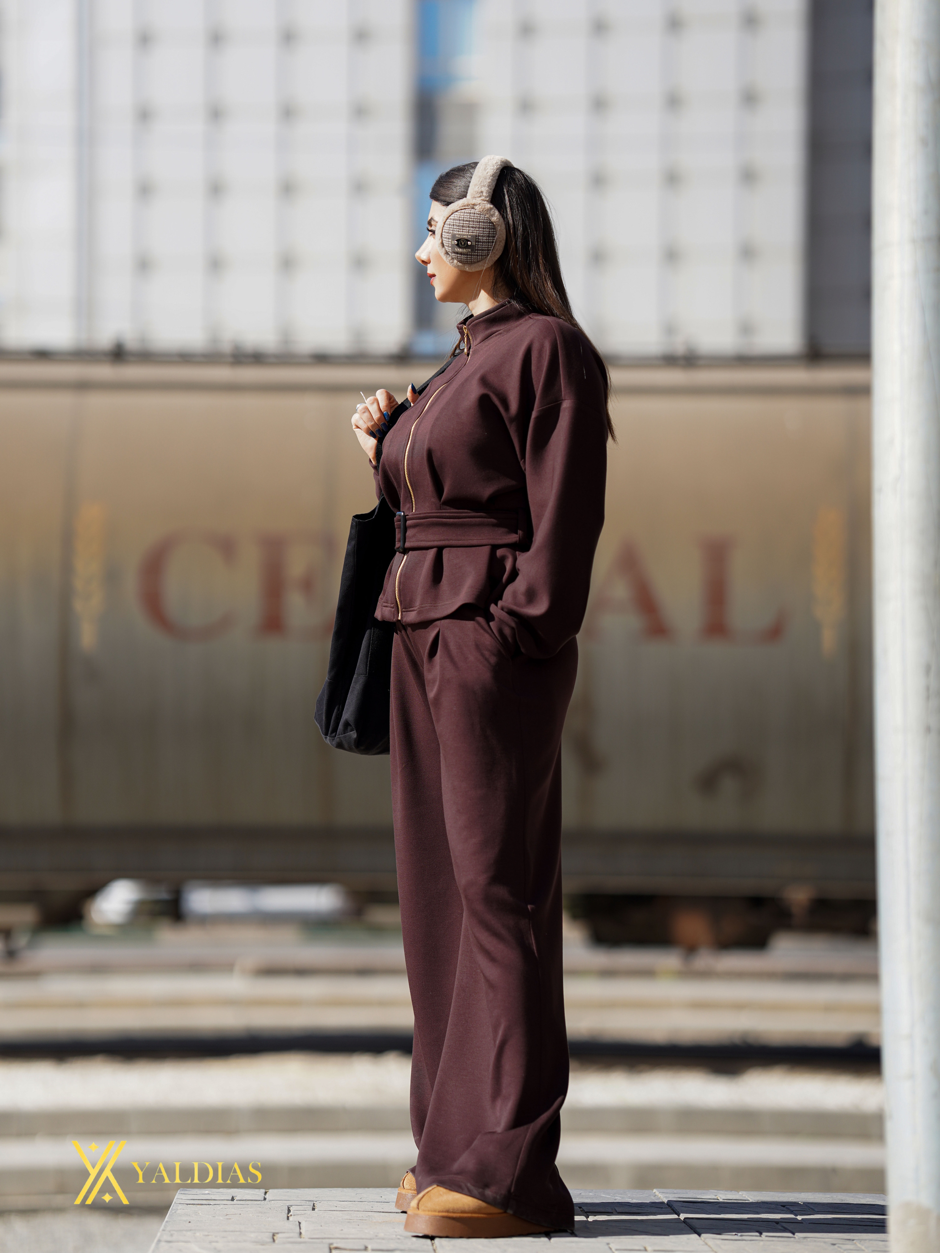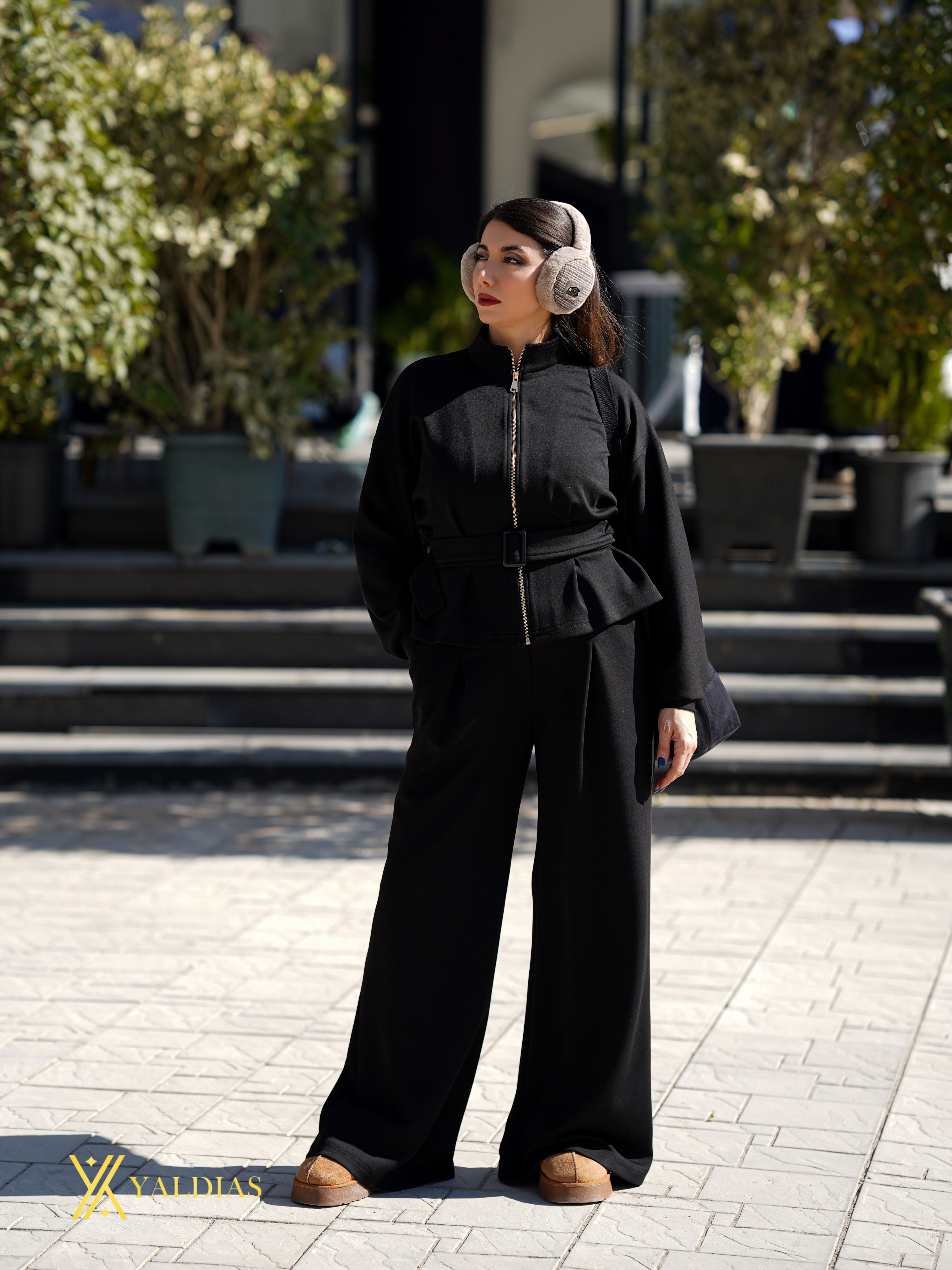 ست شیک و راحت از جنس پارچه اویشو با گرماژ بالا و ریزش لوکس، مجهز به زیپ با کیفیت و کمربند برای تنظیم فرم کمر. شلوار دارای فاق بلند، دکمه و زیپ و جای کمربند برای راحتی و استایل بهتر است.